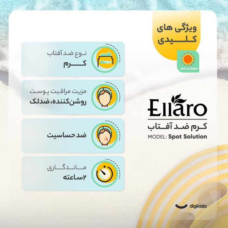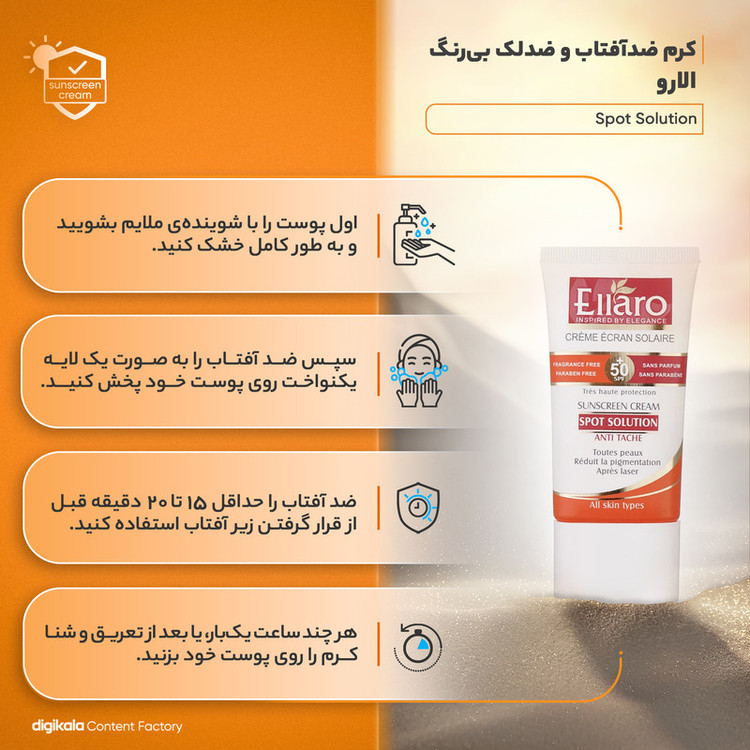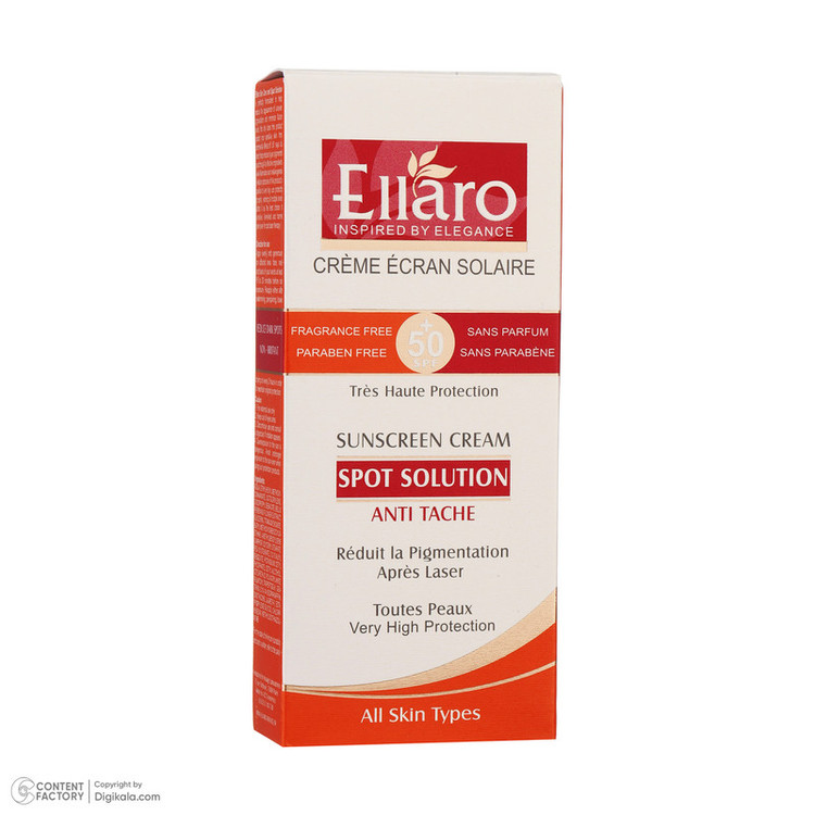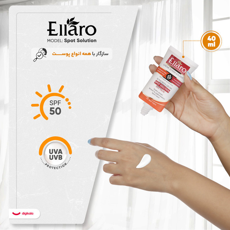 کرم ضد آفتاب اسپات سولوشن الارو با SPF50 حاوی ماده موثر عصاره گل مینای چمنی، یک ضد لک موثر و قوی است. در کنار نئوترازن بهعنوان یک مرطوبکننده، ضد قرمزی، التیام بخش و ضد حساسیت قوی این کرم ضد آفتاب را مناسب پس از لیزر و مراقبتهای پوستی نموده است. برای افرادی که مستعد لکهای پوستی هستند یا لکهای آنها در فصلهای گرم بیشتر میشود نیز میتواند یک پیشگیریکننده قوی باشد.