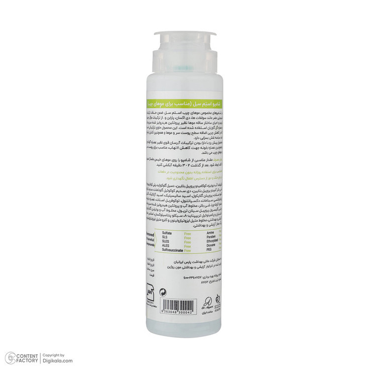 شامپو مو استم سل مناسب موهای چرب مناسب برای رفع چربی مازاد پوست سر و تنظیم ترشح سبوم است که در حجم 250 میلی لیتر ارائه می گردد.