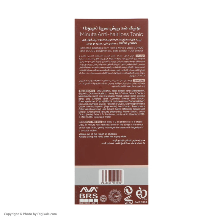 تونیک مینوتا سریتا بر پایه پلی فنول های DHQG و EGCG2، عصاره ریحان و عصاره جو دوسر فرموله شده است. این تونیک با تنظیم چرخه رشد مو و افزایش گردش خون به پوست سر، مانع از ریزش تارهای مو می شود. تونیک ضد ریزش مو سریتا از طریق مهار فاکتورهای التهابی، به تسکین پوست سر کمک می کند.