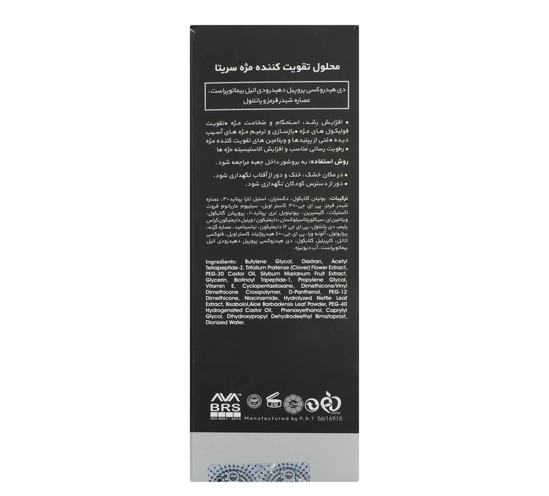 لوسیون تقویتکننده مژه سریتا یک محصول مؤثر در بسته بندی ریمل با قلم مویی به حجم 8 میلی لیتر ساخت ایران است که به افزایش رشد، استحکام و ضخامت مژهها کمک میکند.