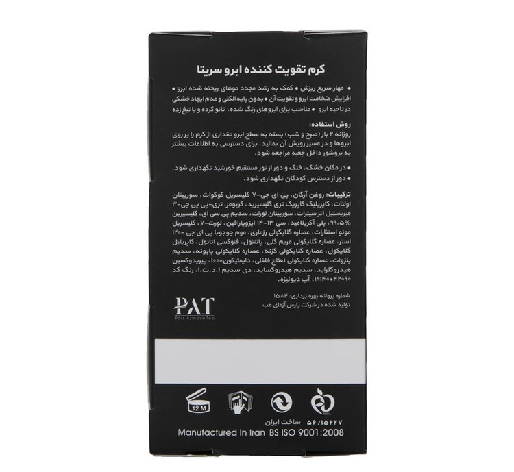 عمل برداشتن ابرو و یا بعضا تیغ زدن آن برای دراز مدت به علت آسیب هایی که به صورت فیزیکی به پوست در این ناحیه وارد می کند باعث التهاب موضعی شده که متعاقب آن سبب آسیب دیدگی پوست و ابرو می شود، پیر شدن، چروک شدن و یا تیره شدن سریعتر پوست در ناحیه ابرو را بدنبال دارد، کرم گیاهی تقویت کننده ابرو سریتا با خاصیت ضد التهابی و ضد پیری خود که ناشی از ترکیبات آنتی اکسیدان و تغذیه کننده پوست است این عوارض را به تعویق می اندازد.