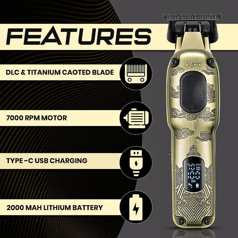 بدنهی فلزی براق با رنگ برنجی باعث شده که V-954 ظاهر خاص و چشمگیری داشته باشه. سطح دستگاه ضدلغزش طراحی شده تا حتی وقتی دستت خیس یا مرطوبه، دستگاه از دستت سر نخوره. در این ریش تراش صفحهنمایش دیجیتال کوچکی قرار گرفته که میزان شارژ باتری رو نشون میده، که با این صفحه نمایش شما همیشه از میزان شارژ ماشین مطلع هستید. همچنین مدلV-954 مجهز به باتری لیتیومی 2000 میلیآمپری هست که بعد از شارژ کامل، تا حدود ۴ ساعت استفادهی مداوم جواب میده. درگاه این دستگاه USB Type-C هست که به راحتی می شود با کابل موبایل یا پاوربانک هم شارژش کنی، که برای سفر یا استفادهی شخصی یا در مواقع قطعی برق خیلی کاربردیه.