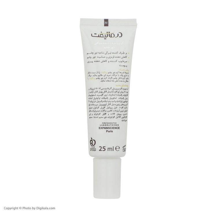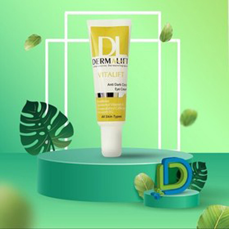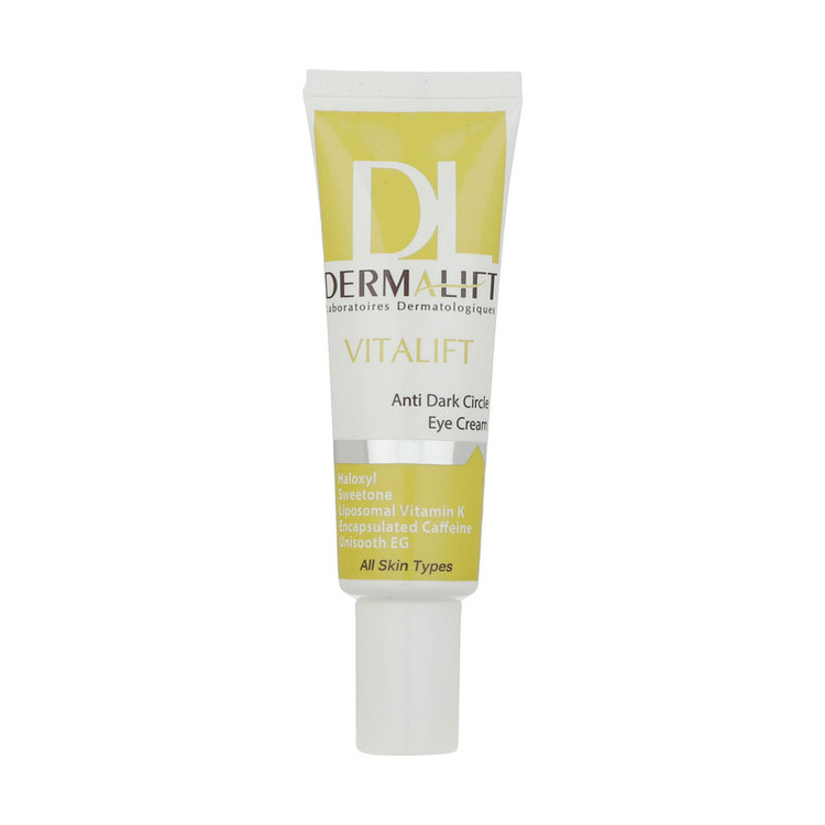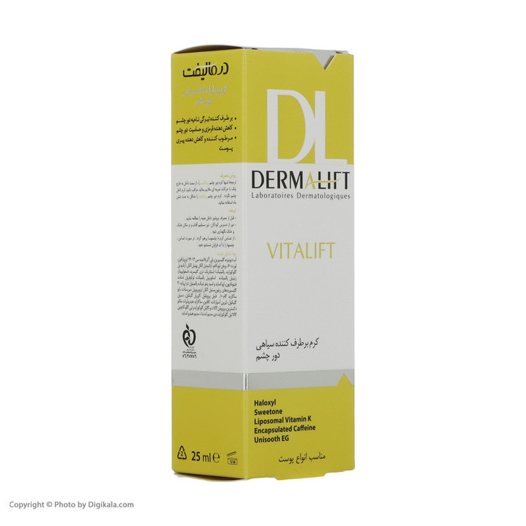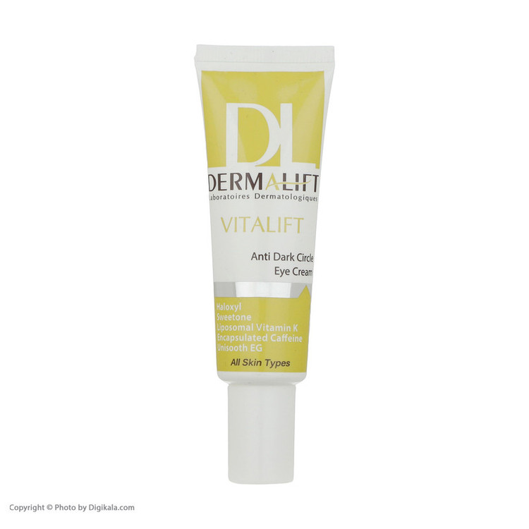 کرم دور چشم درمالیفت ویتالیفت با کمپلکسی از مواد گیاهی، ویتامین های مختلف و ترکیبات پپتیدی در تیوپ هایی با حجم 25 میلی لیتری به بازار عرضه می شود. کافئین انکپسوله و ویتامین k موجود در کرم دور چشم درمالیفت زرد سبب رفع حلقه های تیره پوست زیر چشم می شوند. هالوکسیل استفاده شده در ساختار کرم دور چشم درمالیفت زرد سبب افزایش گردش خون مویرگی پوست زیر چشم و رفع تیرگی دور چشم می شود. سوئیتون استفاده شده در کرم برطرف کننده سیاهی دور چشم درمالیفت موجب رفع التهاب های پوستی و حساسیت پوست دور چشم می شود. ویتامین های (A ،C ،E ،K و B5) به شکل کپسول های لیپوزومال در کرم ضد تیرگی دور چشم درمالیفت استفاده شده اند و نقش موثری در روشن کردن پوست دور چشم و جلوگیری از بروز علائم پیری زودرس پوست دارند. همچنین در فرمولاسیون این کرم، ماده آسپارلین وجود دارد که با اثر مثبت روی متابولیسم سلولهای پوست، به بازسازی و ترمیم سلول ها کمک می کند.